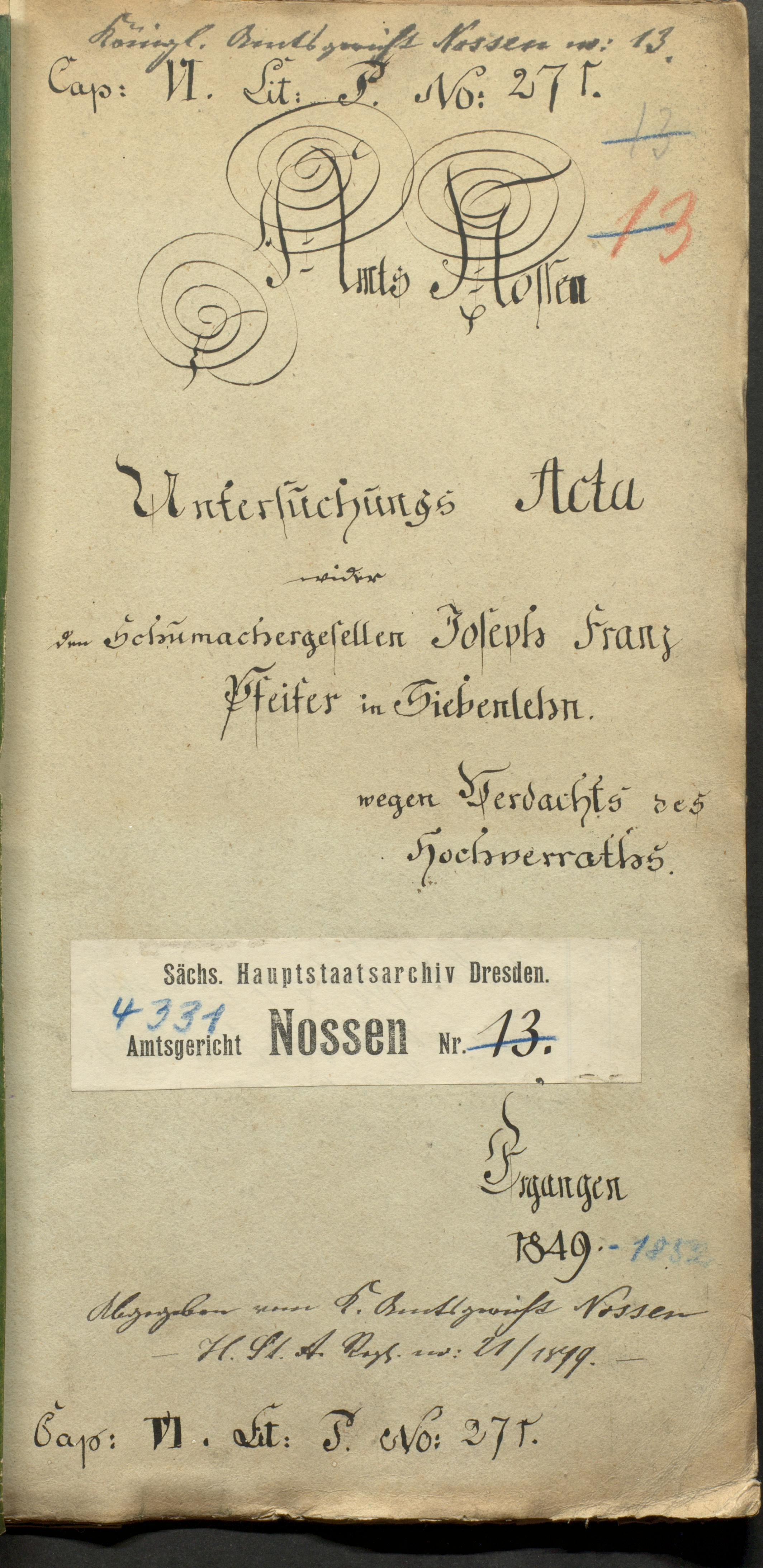 Der Schuhmachergeselle Joseph Franz Pfeifer in Siebenlehn hat es dem bei der denselben wegen Verdachts der Theilnahme an dem Maiaufstande allhier anhängigen Untersuchung zwar einbekannt,
