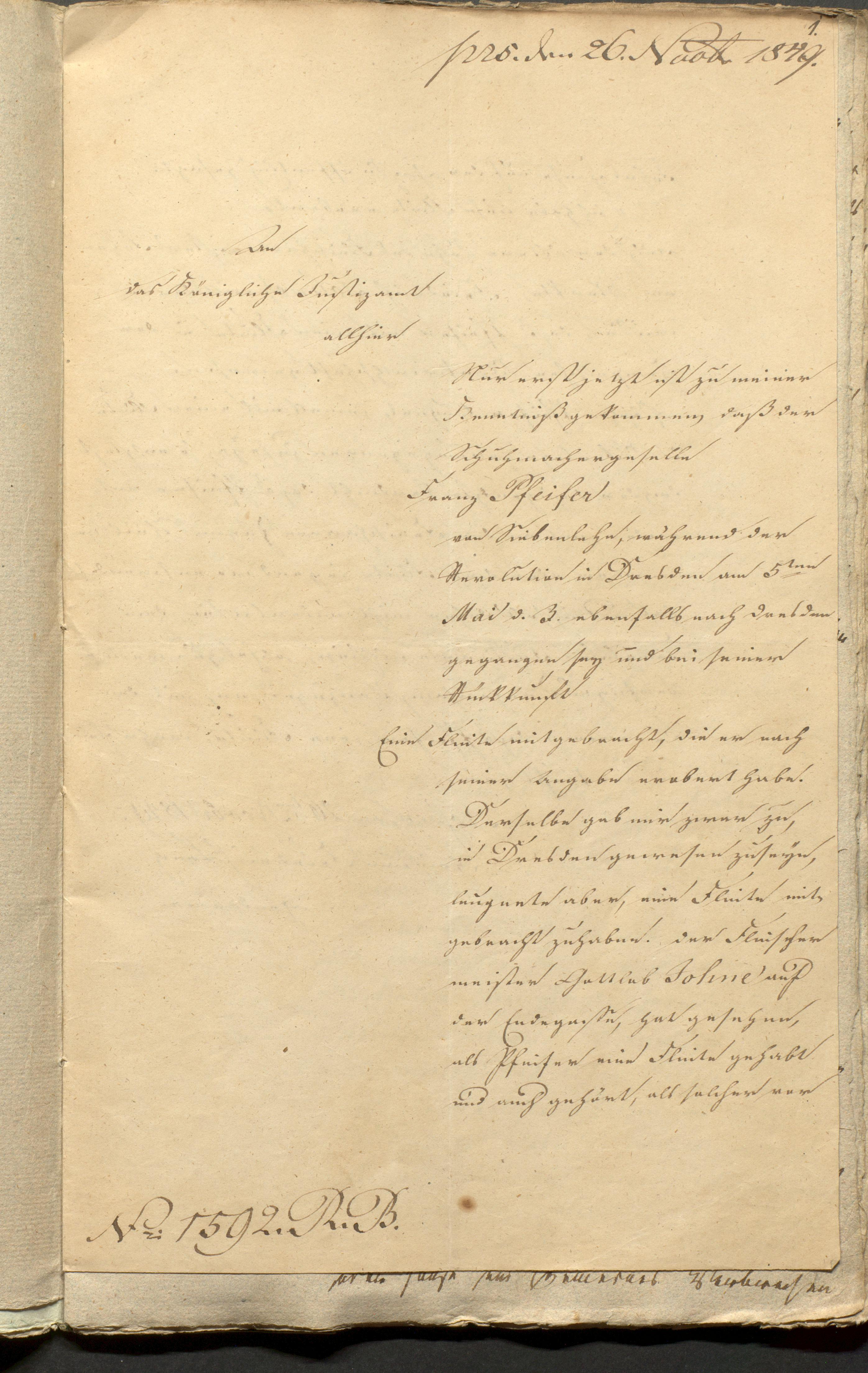 Zur Untersuchung wider den Schuhmachergesellen Joseph Pfeiffer übersenden wir dem geehrten obgedachten Königl. Justizamte das, in Verfolg der jenseitigen, unterm 11/17. Decbr. diese Js. anher ergangenen Requisition, über die Abhörung der verehel. Haase aufgenommene Protokoll in beglaubigter Form mit dem Ersuchen um Berichtigung der bei verzeichneten Kosten.