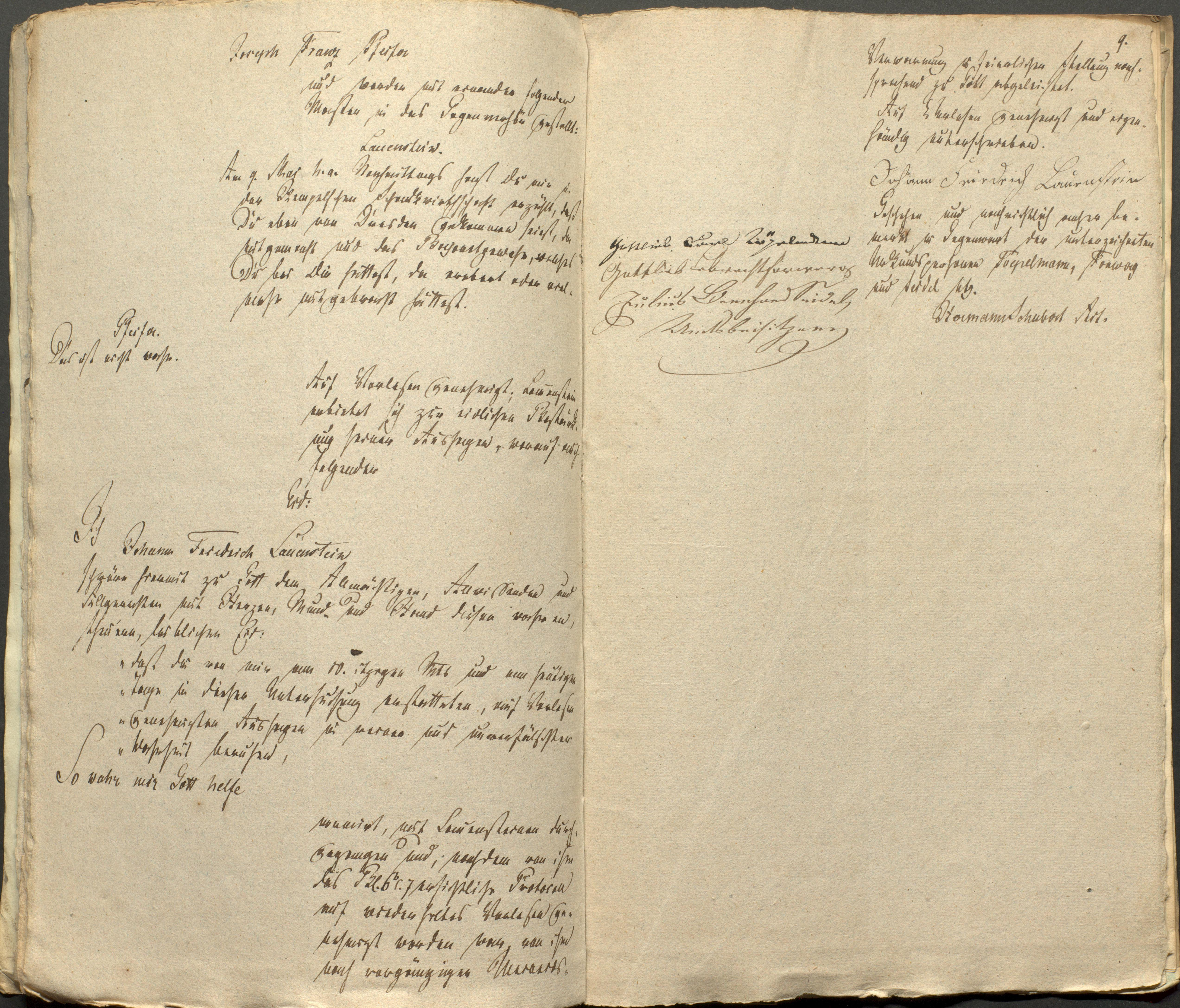 ..irt, mit Lauensteinen durchgegangen und; nachdem von ihm das Bl.6b c.7 ersichtliche Protocoll auf wiederholtes Vorlesen genehmigt worden war, von ihm nach vorgängiger Medaeds Verwarnung in feierlicher Stellung nachsprechend zu Gott abgeleistet.